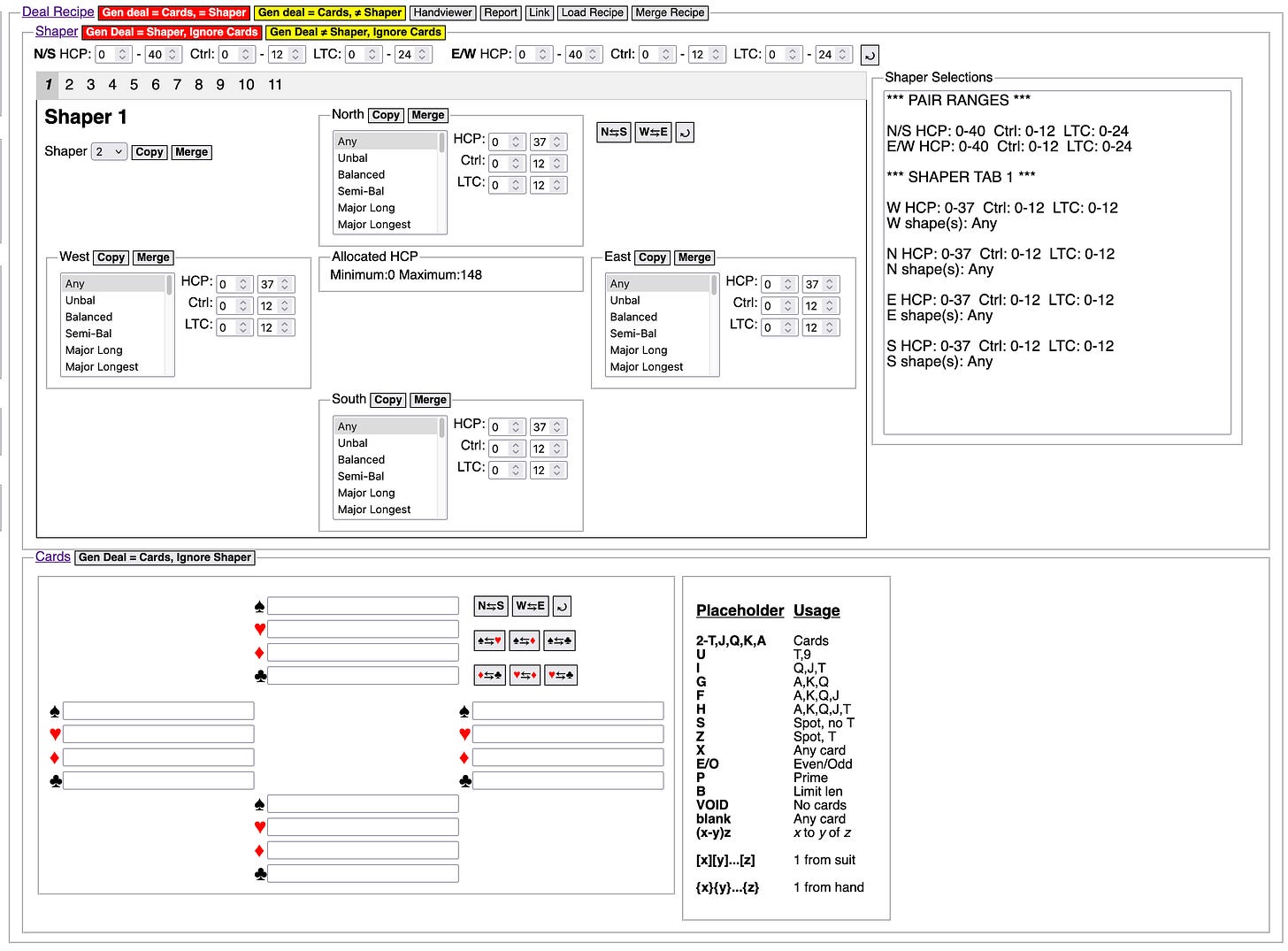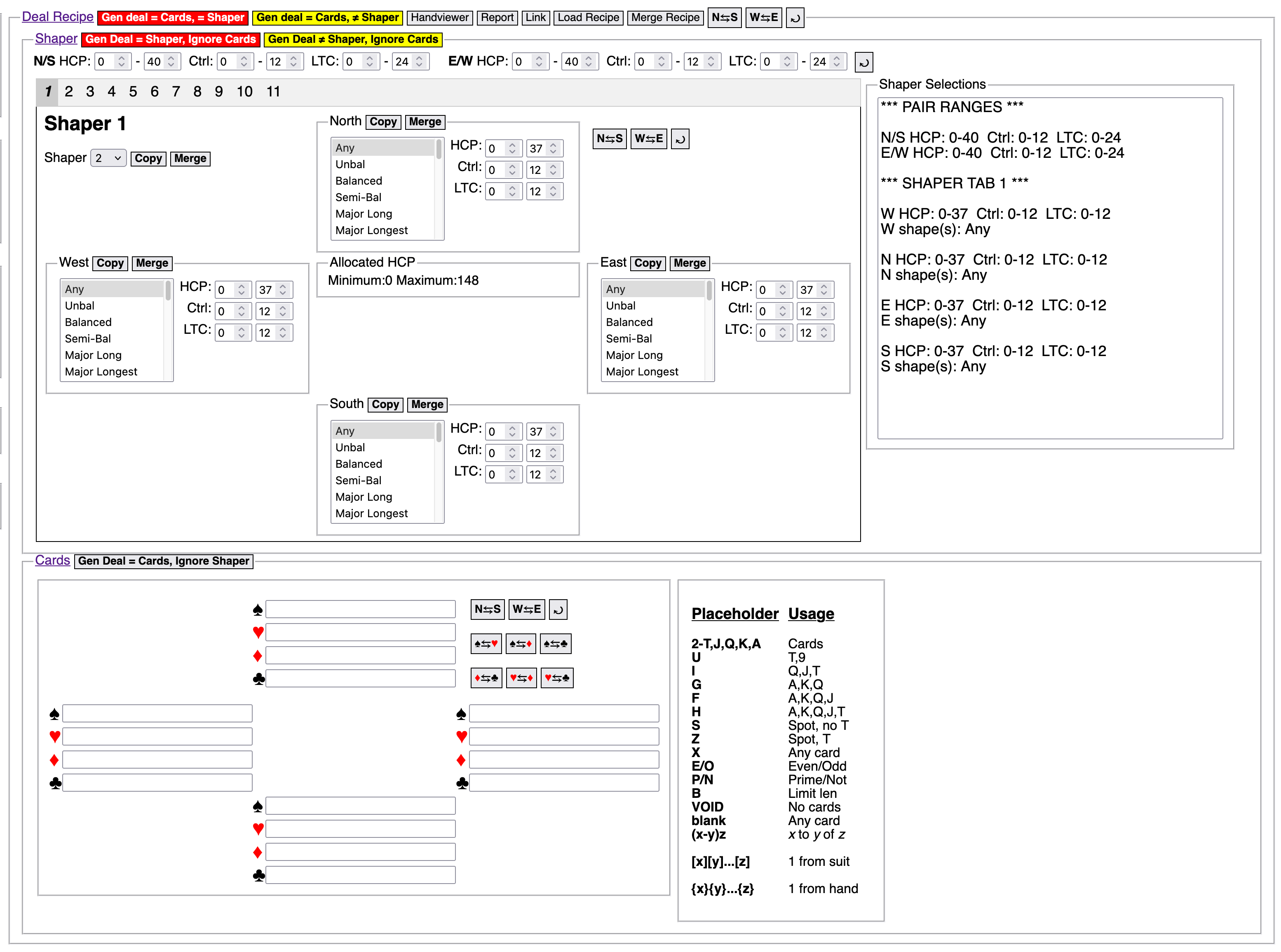 Gen deal = Cards, = Shaper button: Generates deals that conform to both the Cards panel and the Shaper panel. It is red because this function involves the generation and evaluation of a potentially large number of deals, and it may not find a suitable deal.