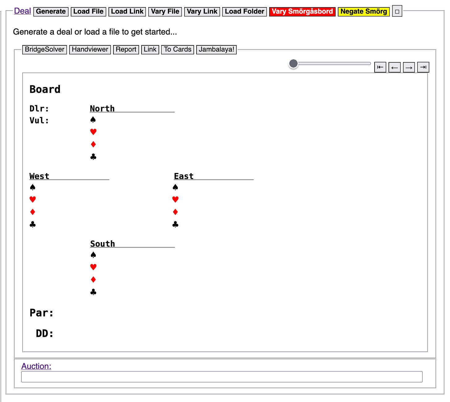 When there is no deal in the Deal display, the Handviewer button lets you load a deal from a Handviewer URL, as detailed in this tutorial.