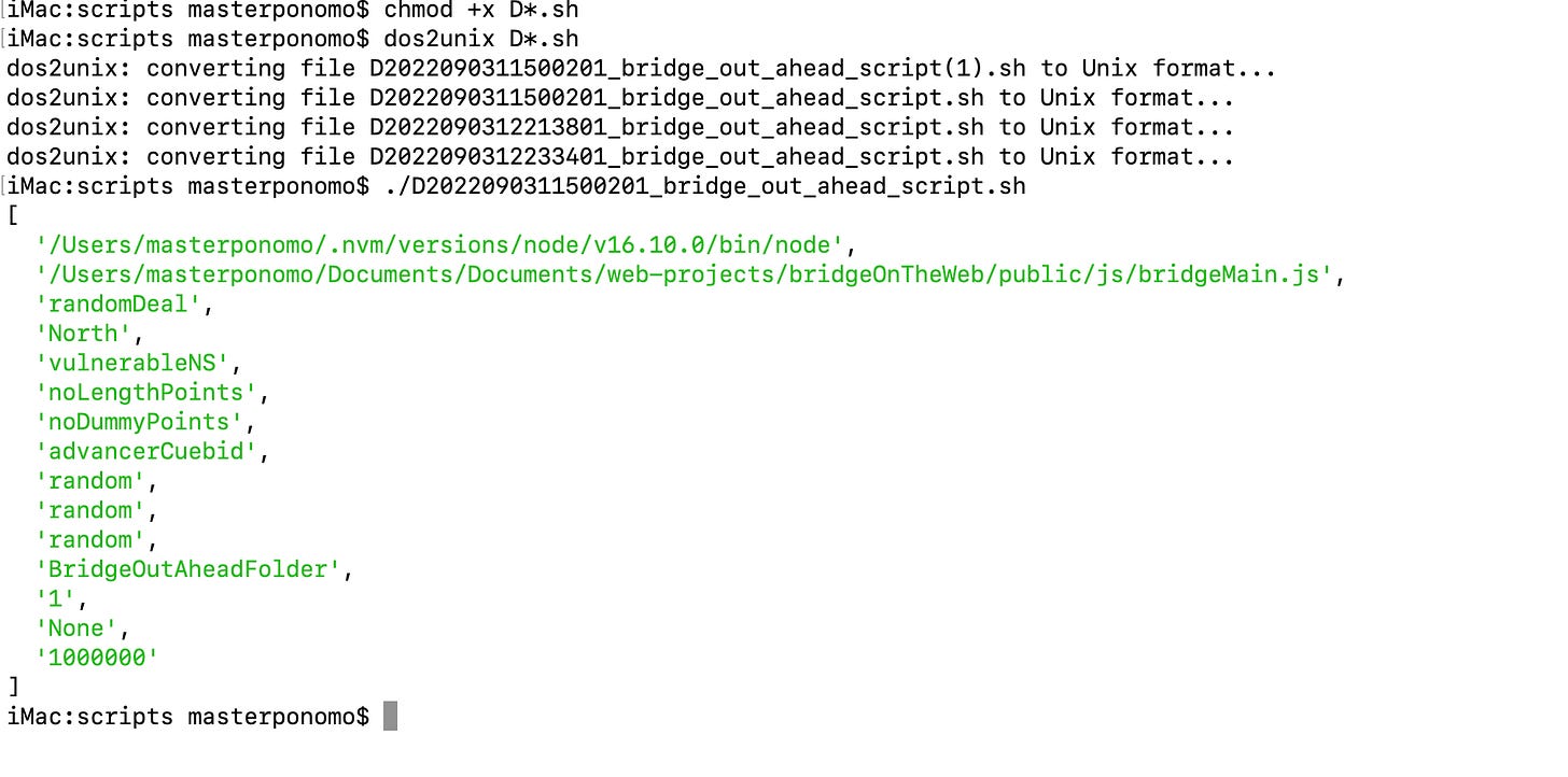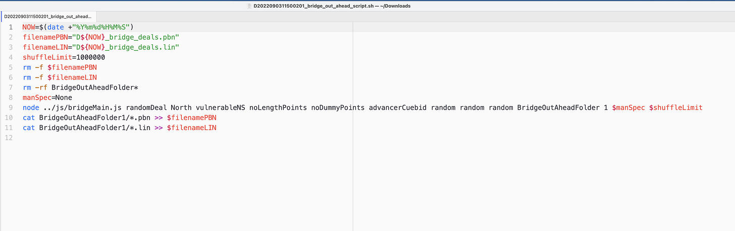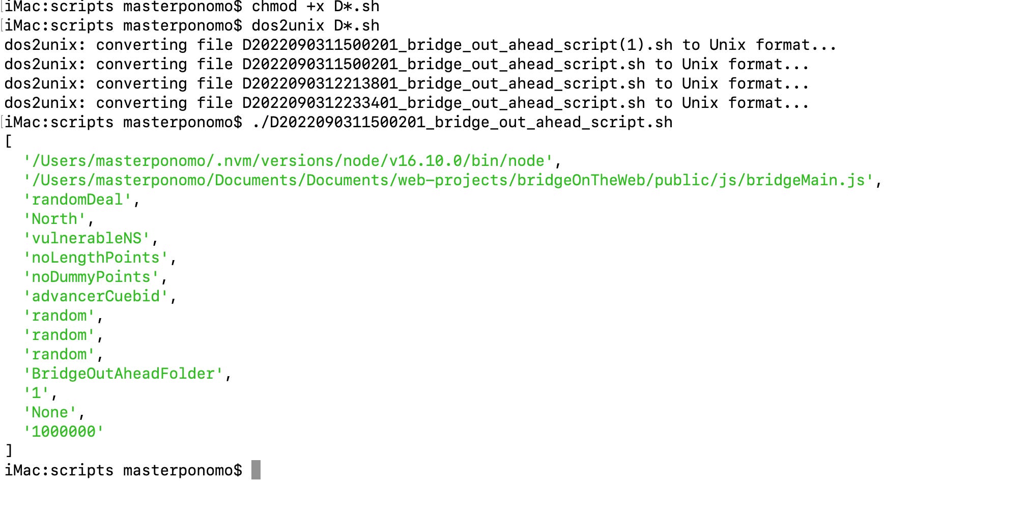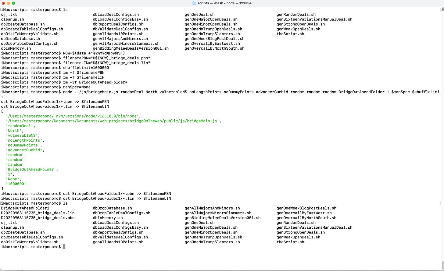 cd ~/Documents/Documents/web-projects/bridgeOnTheWeb/public/scriptsOn the bridge program web page, select Random deal type, North dealer, N/S vulnerable, and 1 for number of deals. There’s nothing special about those values—I just want you to see how your selections affect the resulting script.