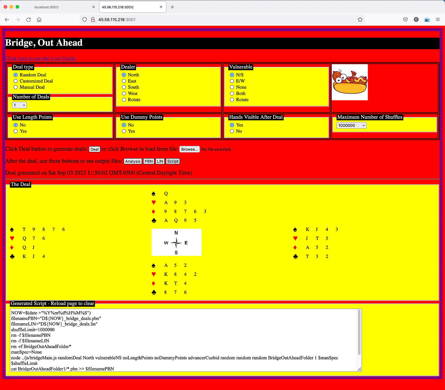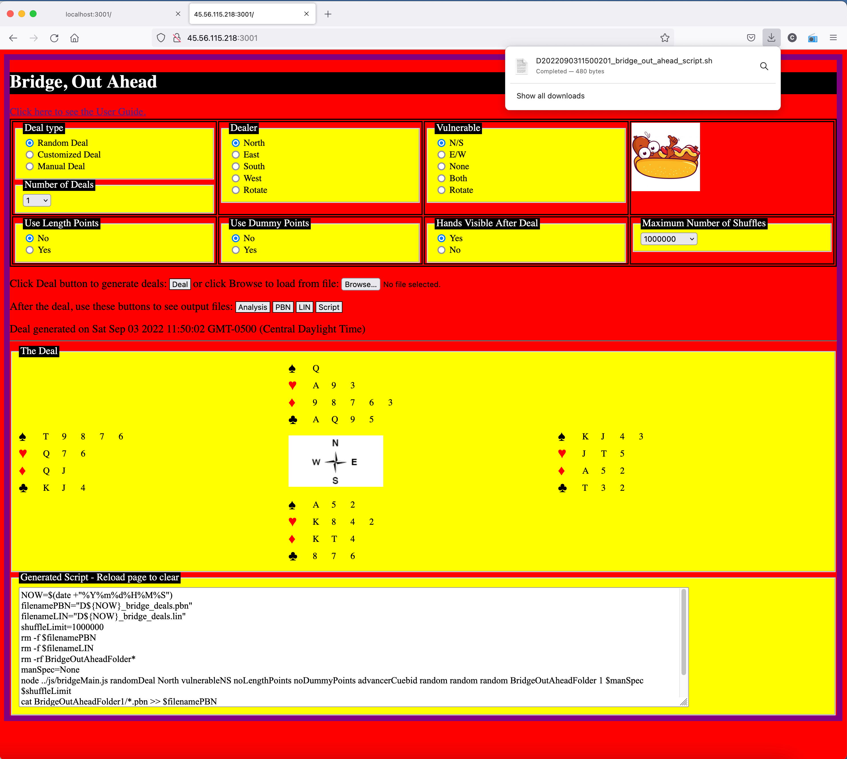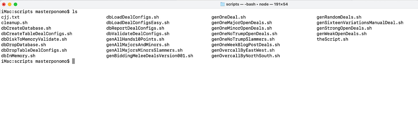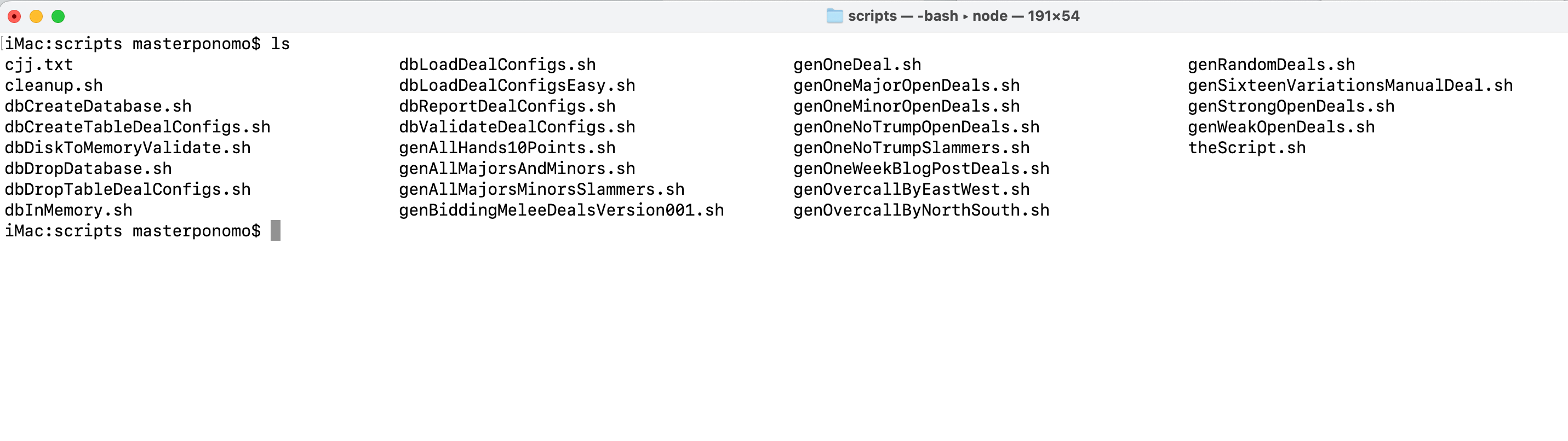 cd ~/Documents/Documents/web-projects/bridgeOnTheWeb/public/scriptsOn the bridge program web page, select Random deal type, North dealer, N/S vulnerable, and 1 for number of deals. There’s nothing special about those values—I just want you to see how your selections affect the resulting script.