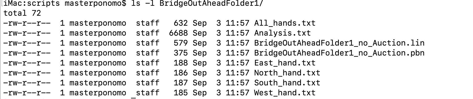 With the script you automatically get extra goodies. See the *.lin and *.pbn files that showed up after we ran the script? Those contain your deal in those formats. Also notice the folder called BridgeOutAheadFolder1. Listing the contents of that folder shows you this: